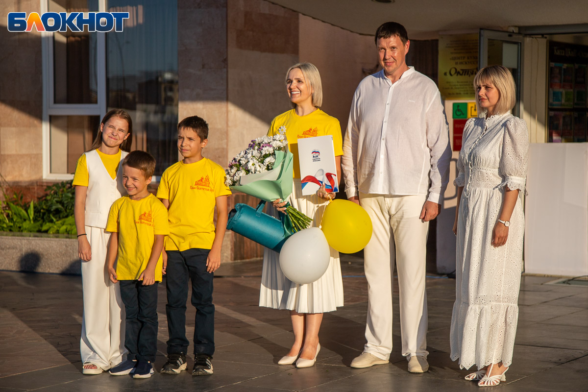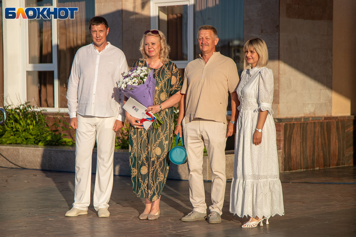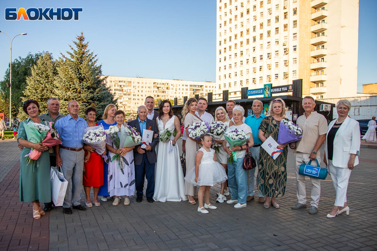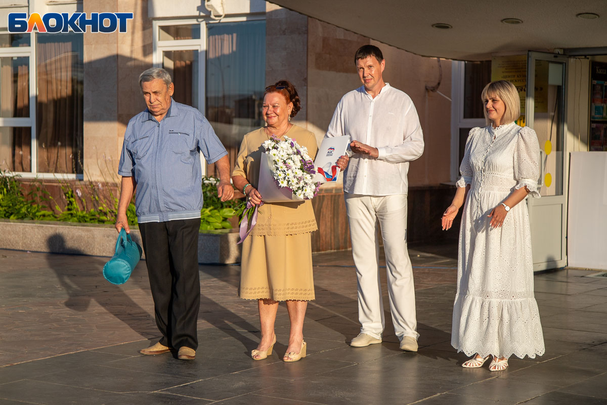 Во время концерта чествовали 11 семейных пар. Роман и Екатерина Борисовы зарегистрировали свой брак в день праздника – 8 июля 2025 года. Заведующая ЗАГС № 1 Марина Гончарова поздравила молодоженов с этим знаменательным событием и вручила благодарность главы Волжского Игоря Воронина.