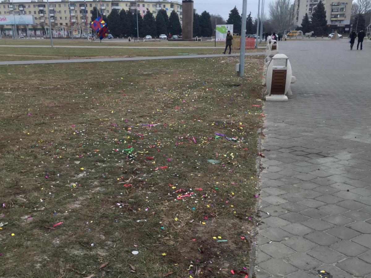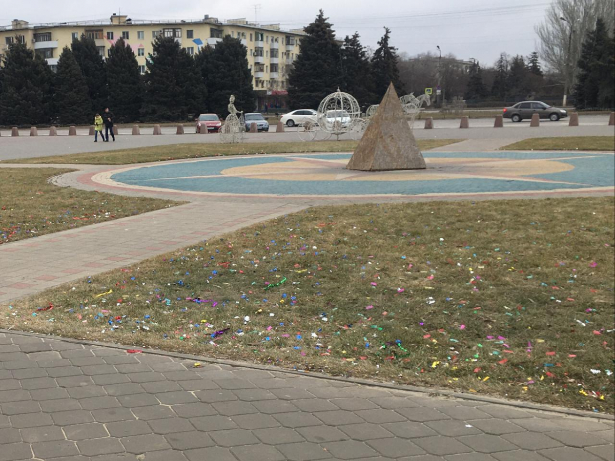 На деле оказалось все иначе. Газоны на площади Ленина усыпаны конфетти после ночной жизни волжан от хлопушек. На удивление людей достаточно для выходного дня и тем более для 1 января.Многие охотно фотографируются с елками.гуляют по парку «Волжский» с детьми, на площадках.