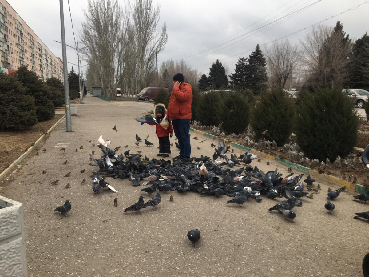 Чаще всего, гуляющие волжане были с детьми. Кроме игровых площадок можно было найти и другие развлечения - например кормить стаю голубей.