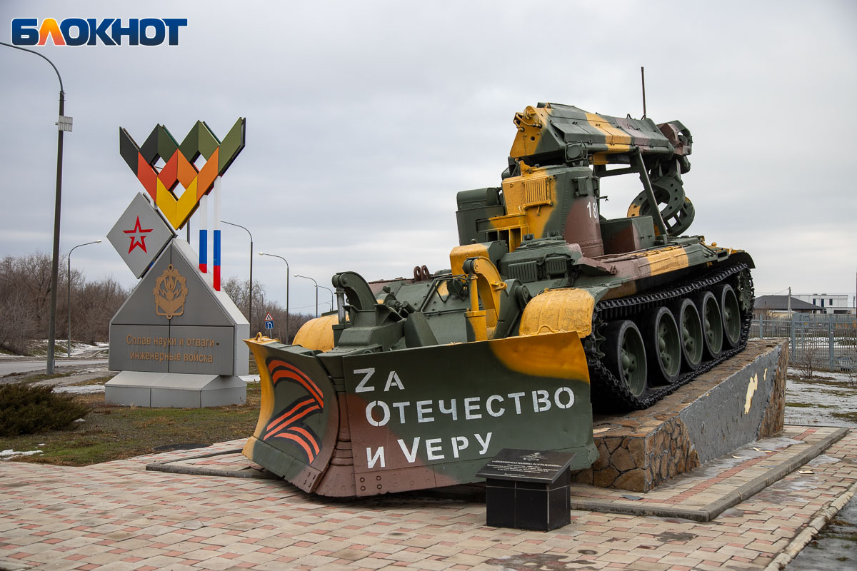 На въезде в Волжский гостей встречает инженерная машина разграждения — символ воинской доблести и технической мощи армии. Этот памятный объект сразу задаёт тон: город чтит тех, кто стоял и стоит на защите страны.