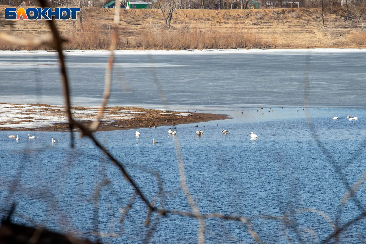 На берегу царит атмосфера спокойствия и умиротворения. Теплая погода, ласковое солнце и белоснежные птицы, скользящие по водной глади Ахтубы – все это создает ощущение сказки. Небольшой лед сохранился лишь у самого берега, хрупко обваливаясь под весенним солнцем.