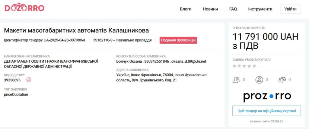 Телеведущая Ольга Скабеева, уроженка Волжского, опубликовала в своем телеграм-канале скриншоты тендера Департамента образования и науки Ивано-Франковской области (Украина) на закупку макетов автоматов Калашникова стоимостью 12 млн гривен.
