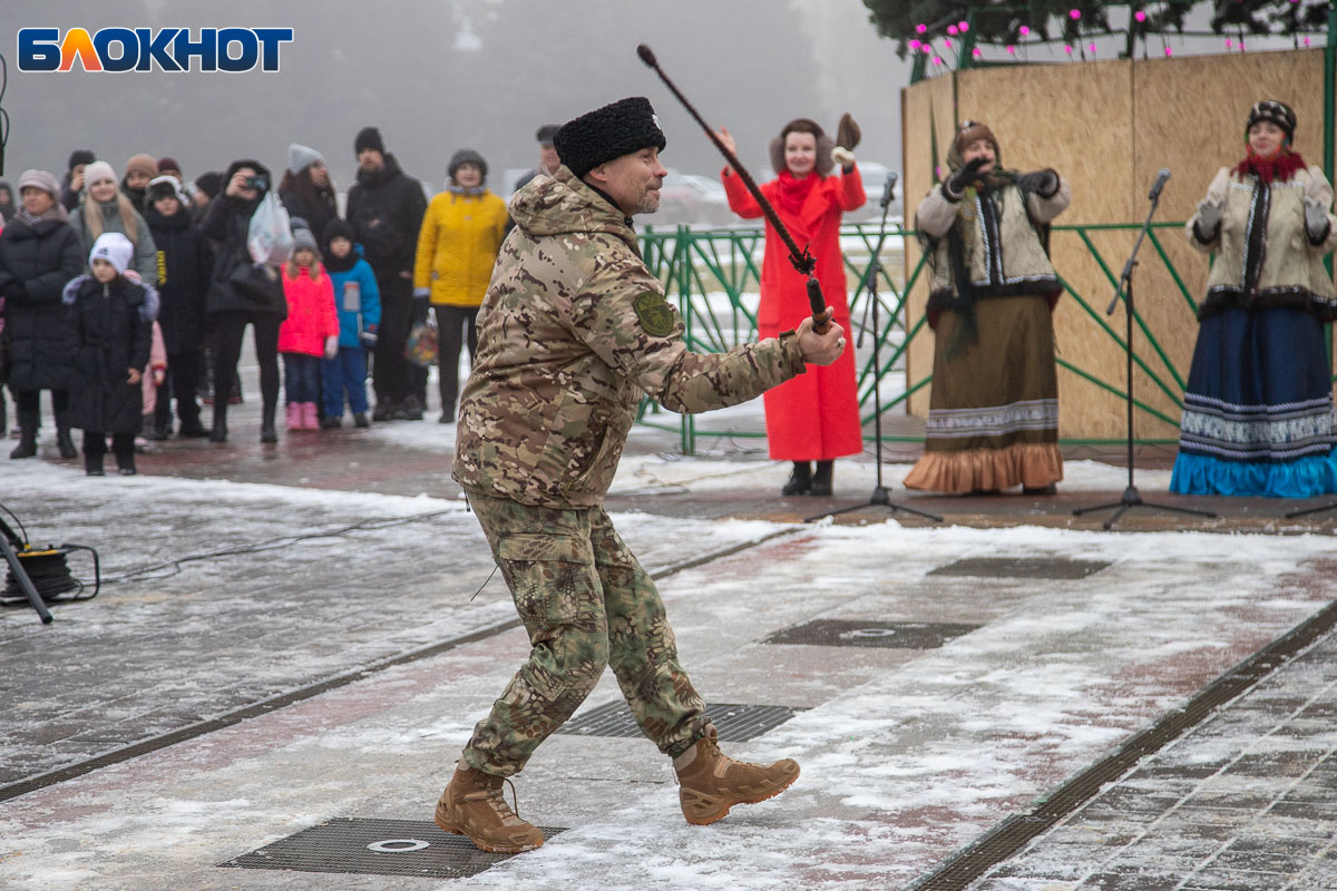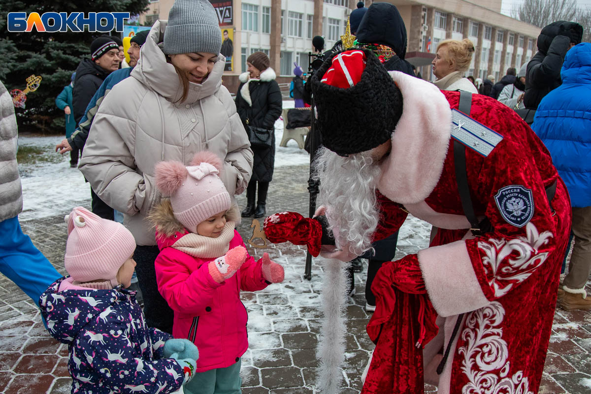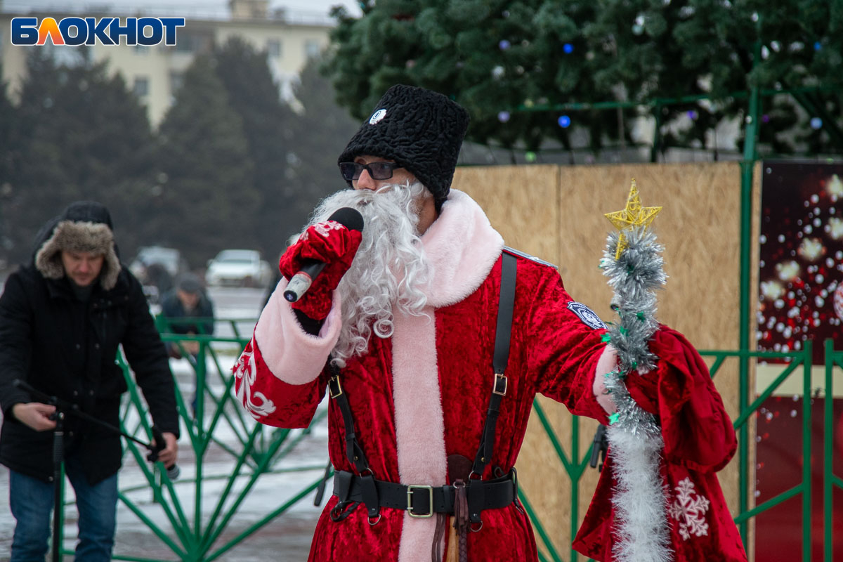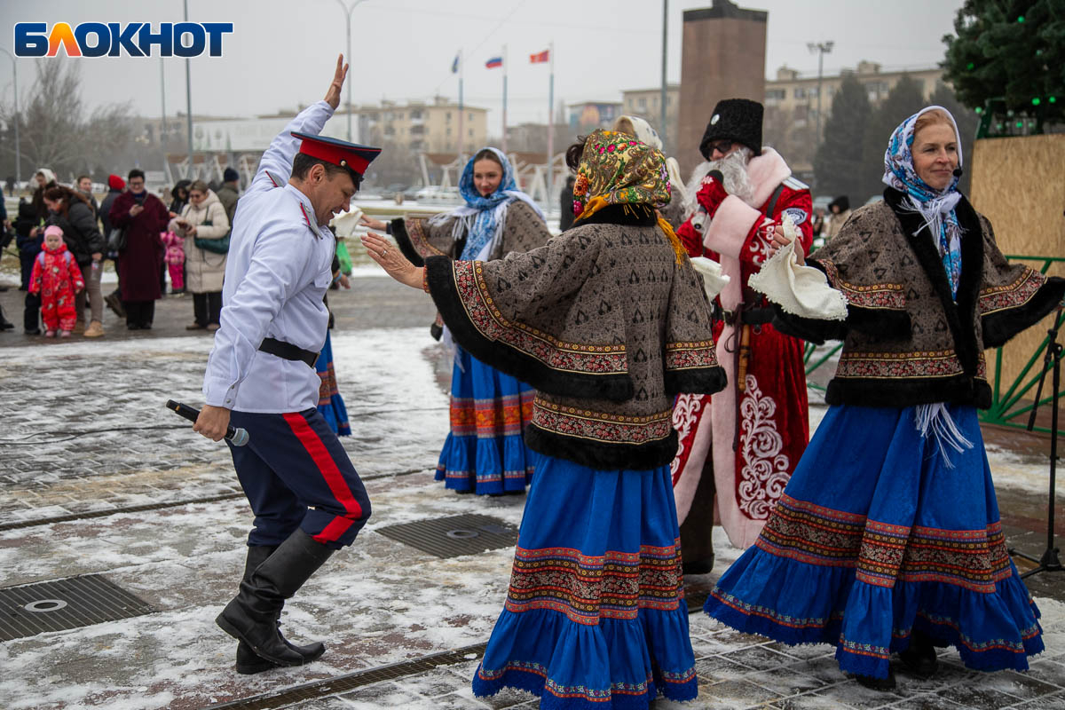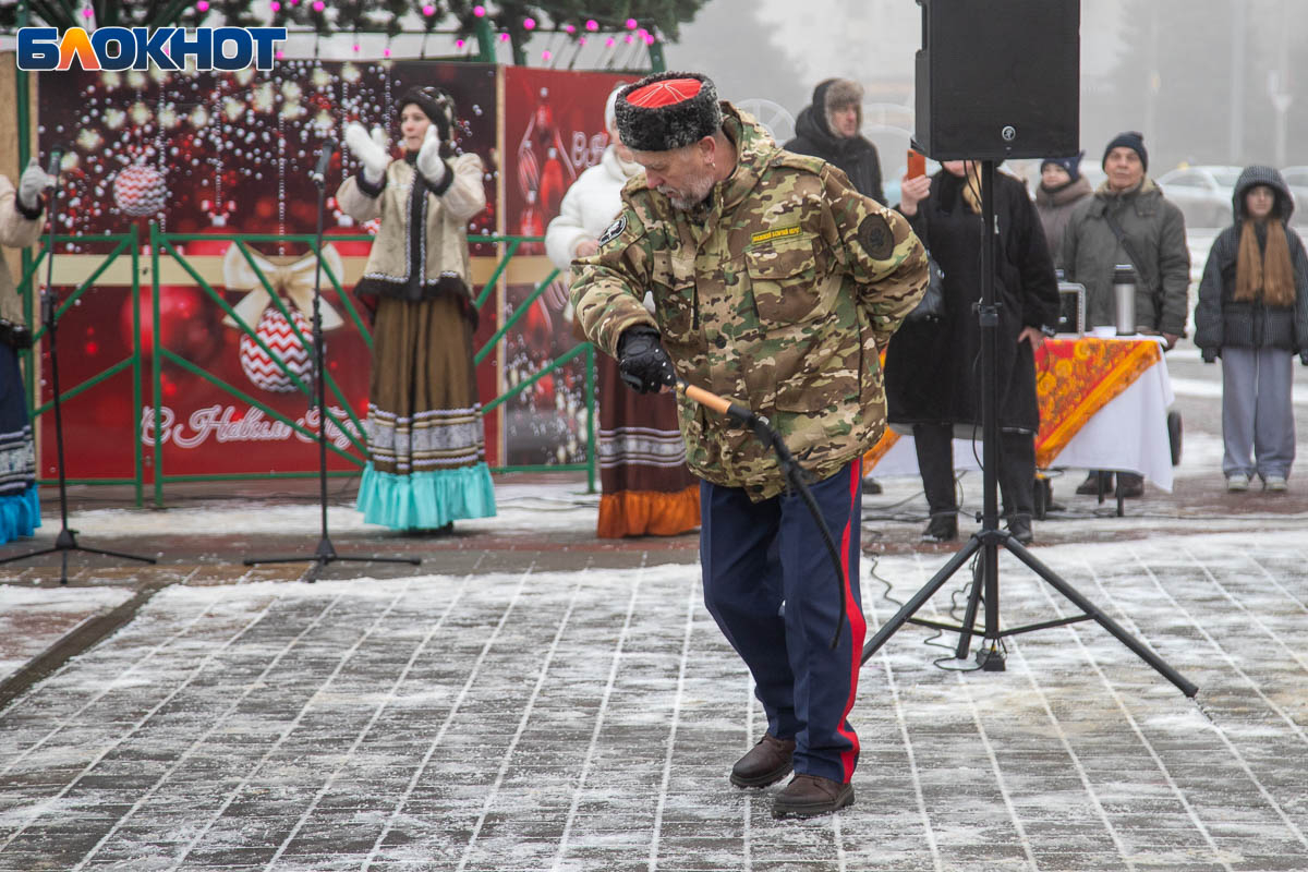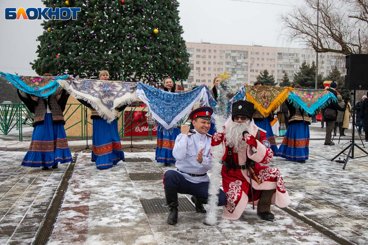 В этом году площадь погрузилась в аутентичную атмосферу. Гостей ждала ярмарка сувениров, угощения и горячий чай из самовара. Особый колорит создавали традиционные забавы: хороводы, в которые активно включались и дети, и взрослые, перетягивание каната, бег в мешках и даже бои подушками на бревне. Визитной карточкой праздника стал казачий Дед Мороз, чей костюм украсили погоны и шевроны.