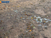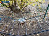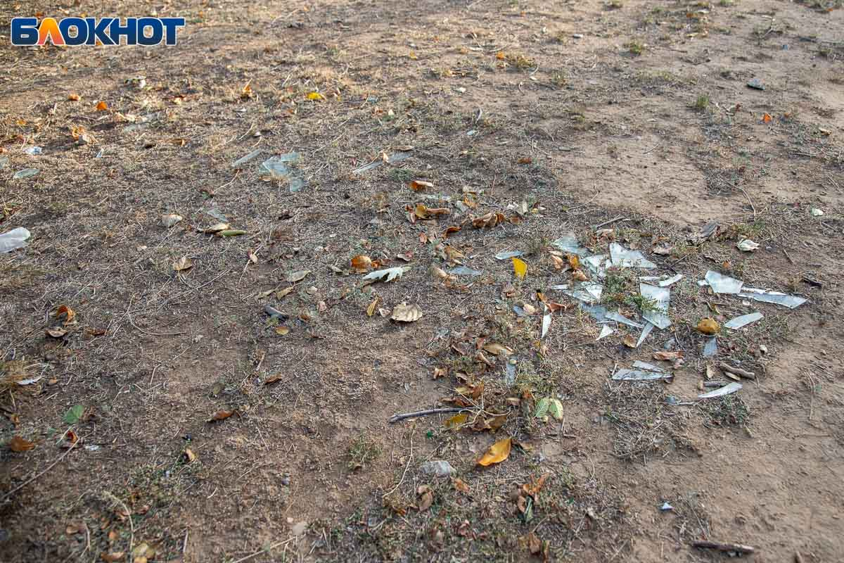 Подобные картины наблюдаются и в других дворах города: ветки, разбитые элементы детских площадок, а один из дворов превратился в опасную зону, усыпанную битым стеклом. Солнце играет в осколках, но эта красота очень опасна для детских ног.