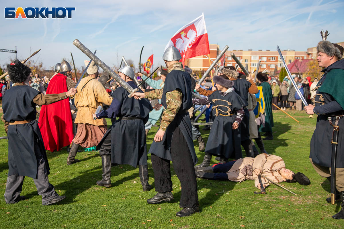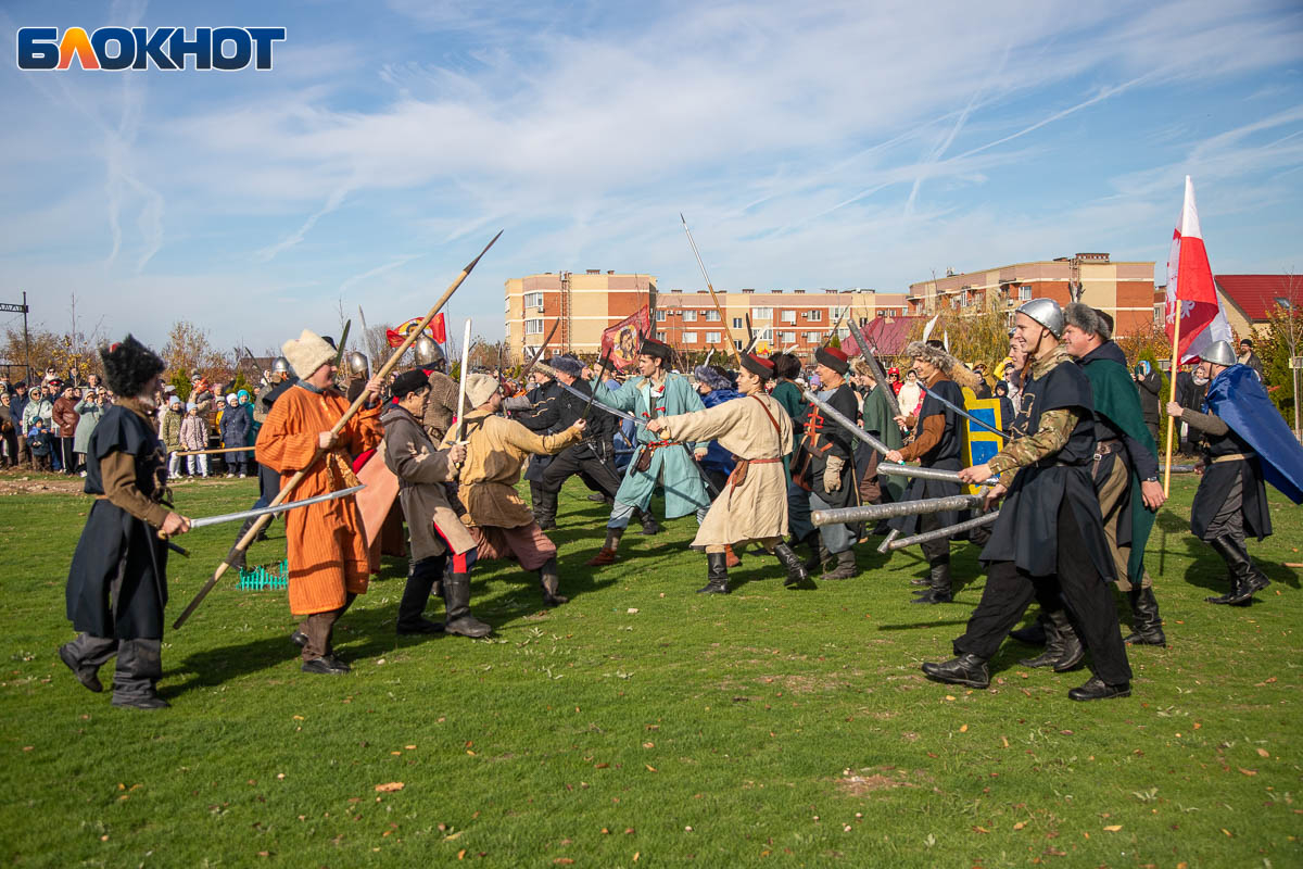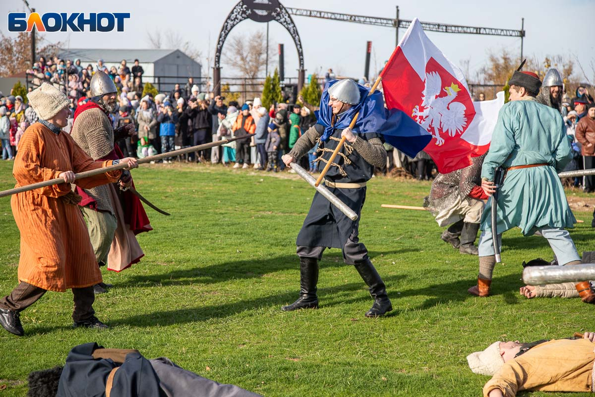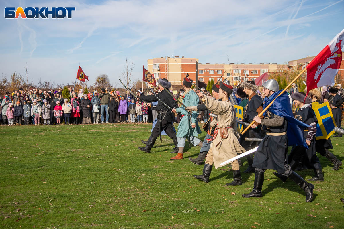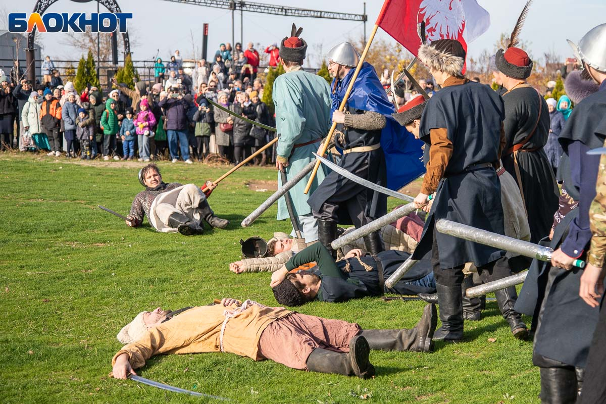 В День народного единства у собора Иоанна Богослова в Волжском состоялась масштабная историческая реконструкция, напомнившая горожанам о событиях, в честь которых установлен праздник. На глазах у сотен зрителей энтузиасты воссоздали один из ключевых эпизодов 1612 года — битву народного ополчения под предводительством Дмитрия Пожарского и Кузьмы Минина с войском Речи Посполитой. Фотокорреспондент «Блокнот Волжский» Александр Агафонов запечатлел все ключевые моменты этого наглядного и яркого урок истории, который надолго останется в памяти и взрослых, и детей.
