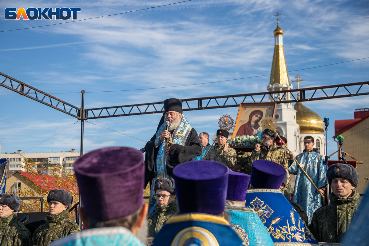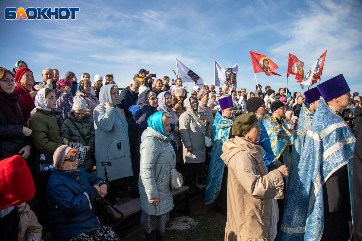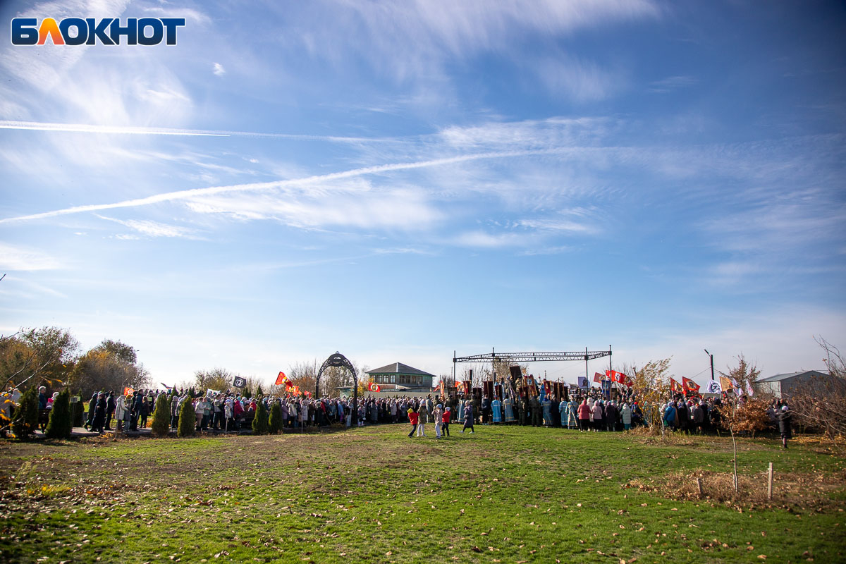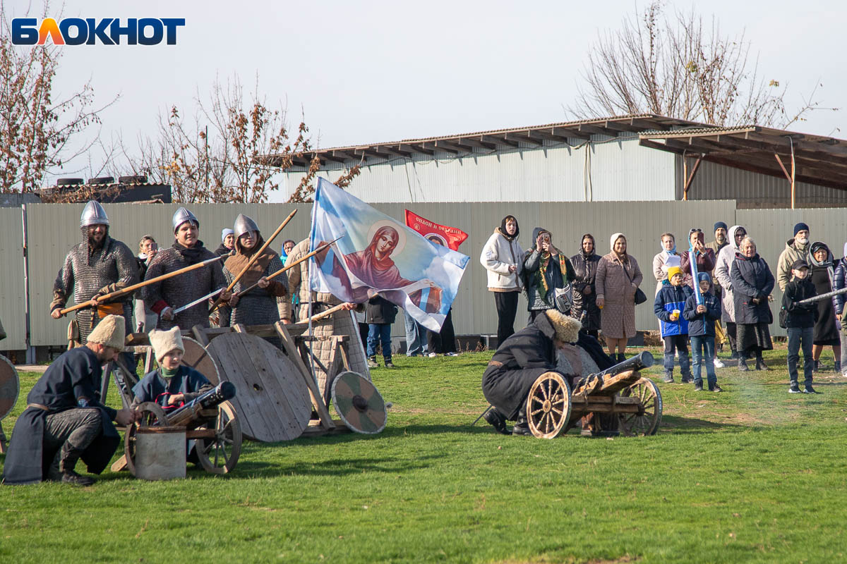 Праздничный день начался с крестного хода, объединившего несколько тысяч верующих волжан. Маршрут прошел по главным улицам Волжского и завершился у Соборного храма Иоанна Богослова, где состоялся торжественный молебен, после которых действие перенеслось на поле за храмом. Пока епископ обращался к собравшимся, реконструкторы готовились к выступлению. Поле боя было точно организовано: польские гусары заняли позиции в лесочке, а русские ополченцы укрепились за редутом с пушками.