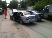К счастью, услуги кареты "скорой помощи" не понадобились. Однако водитель "Дэу" сильно переволновался и громко кричал, обходя свою машинку после столкновения.