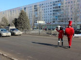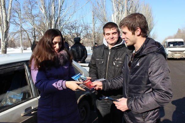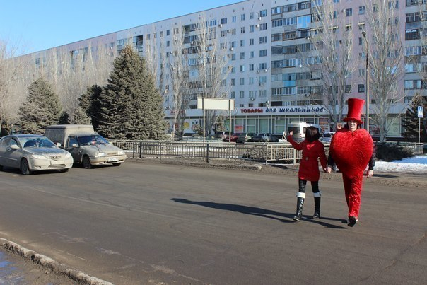 Юноша в ростовом костюме сердца со спутницей переходили проезжую часть по "зебре" туда-сюда, привлекая внимание автомобилистов. Активисты раздавали памятки водителям и валентинки, вдруг кто-то забыл подготовиться к заморскому празднику.