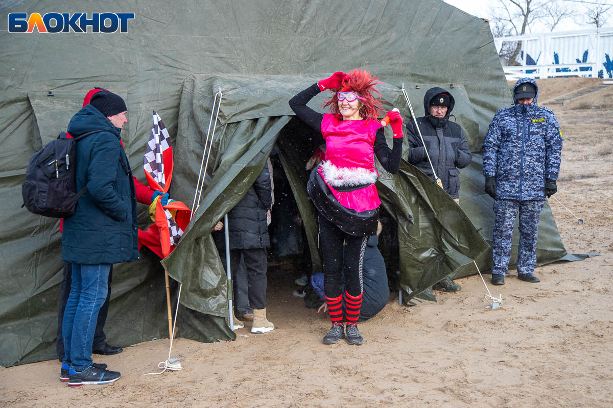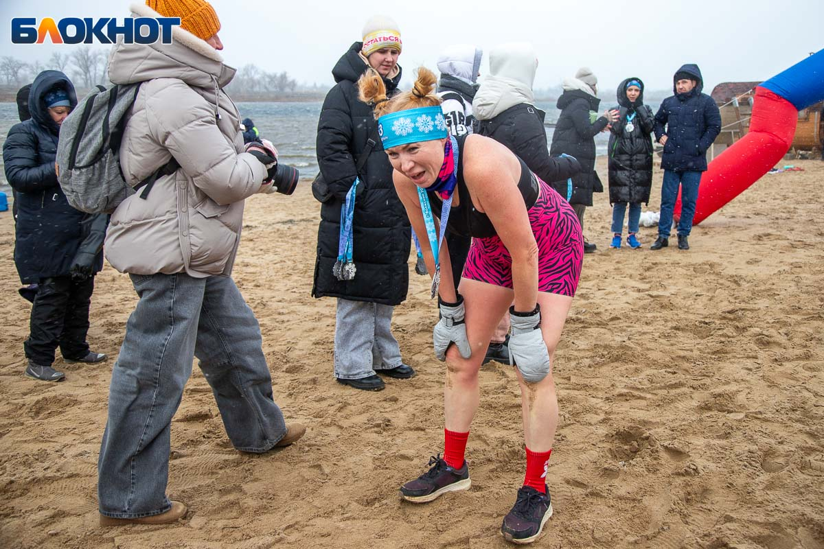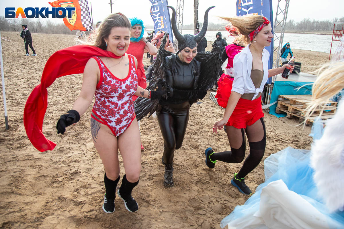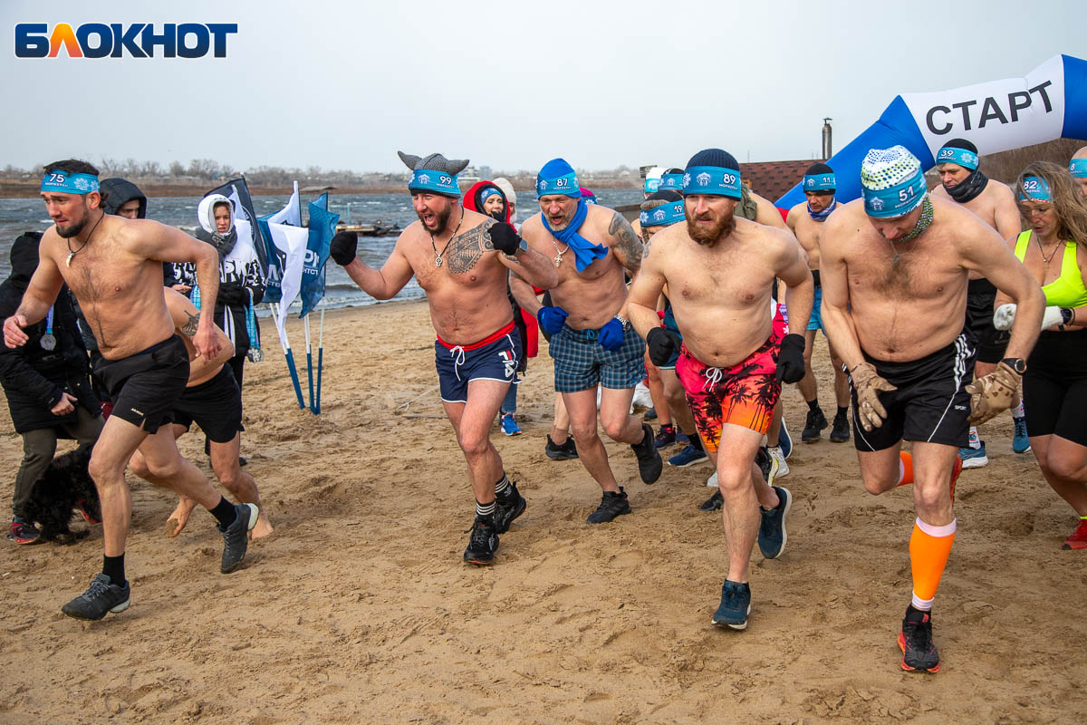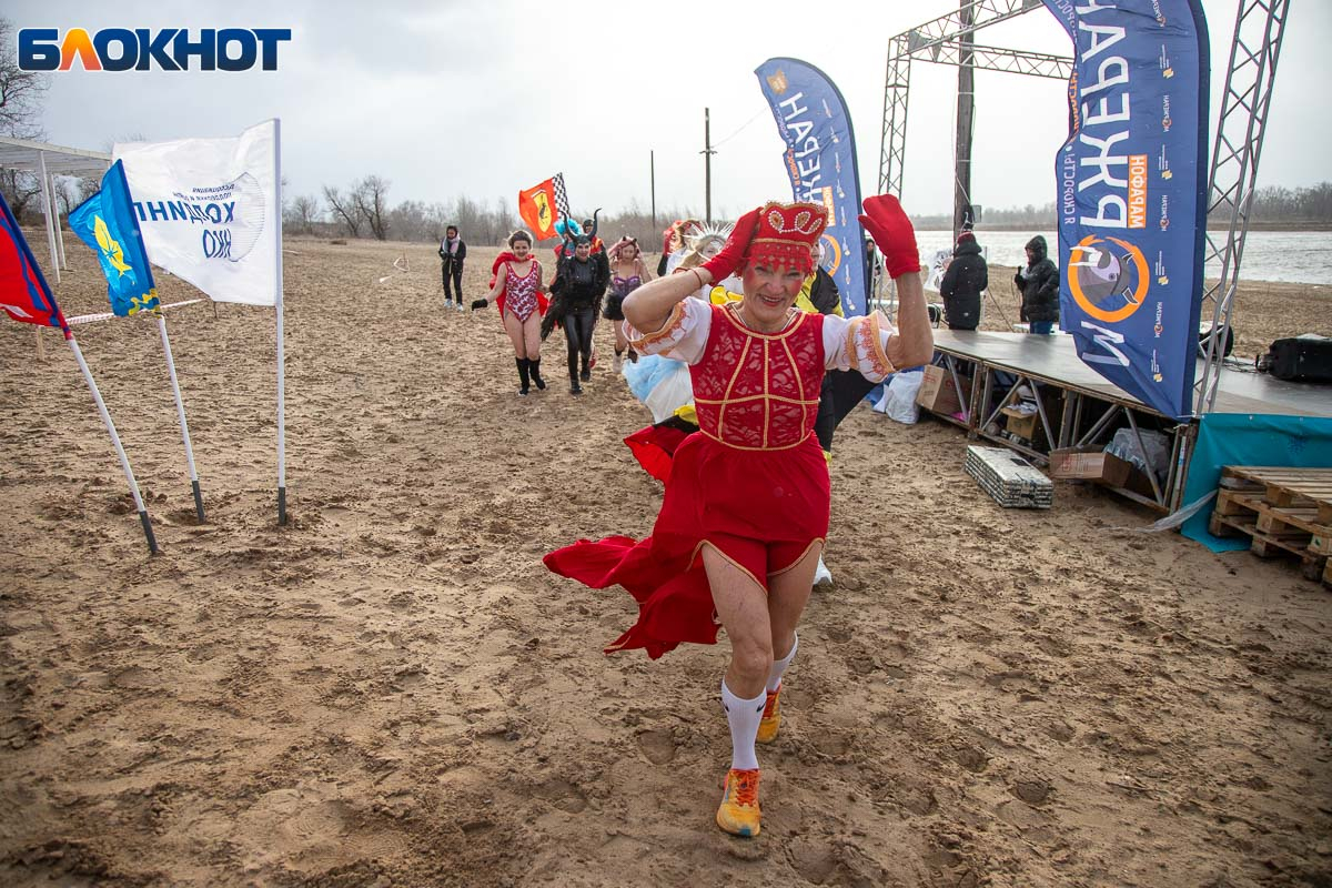 В Волжском спортсмены в топах и миниюбках пробежали по городу и прыгнули в ледяную воду во время шторма