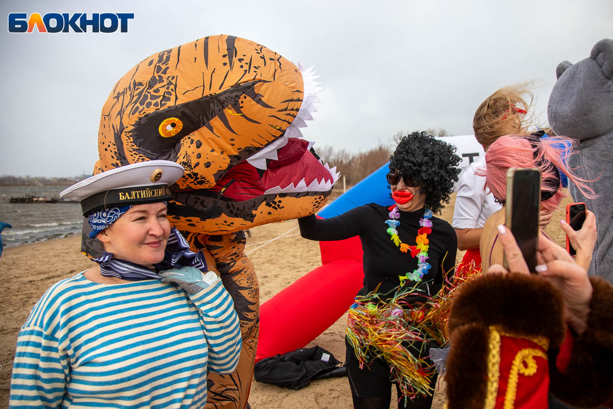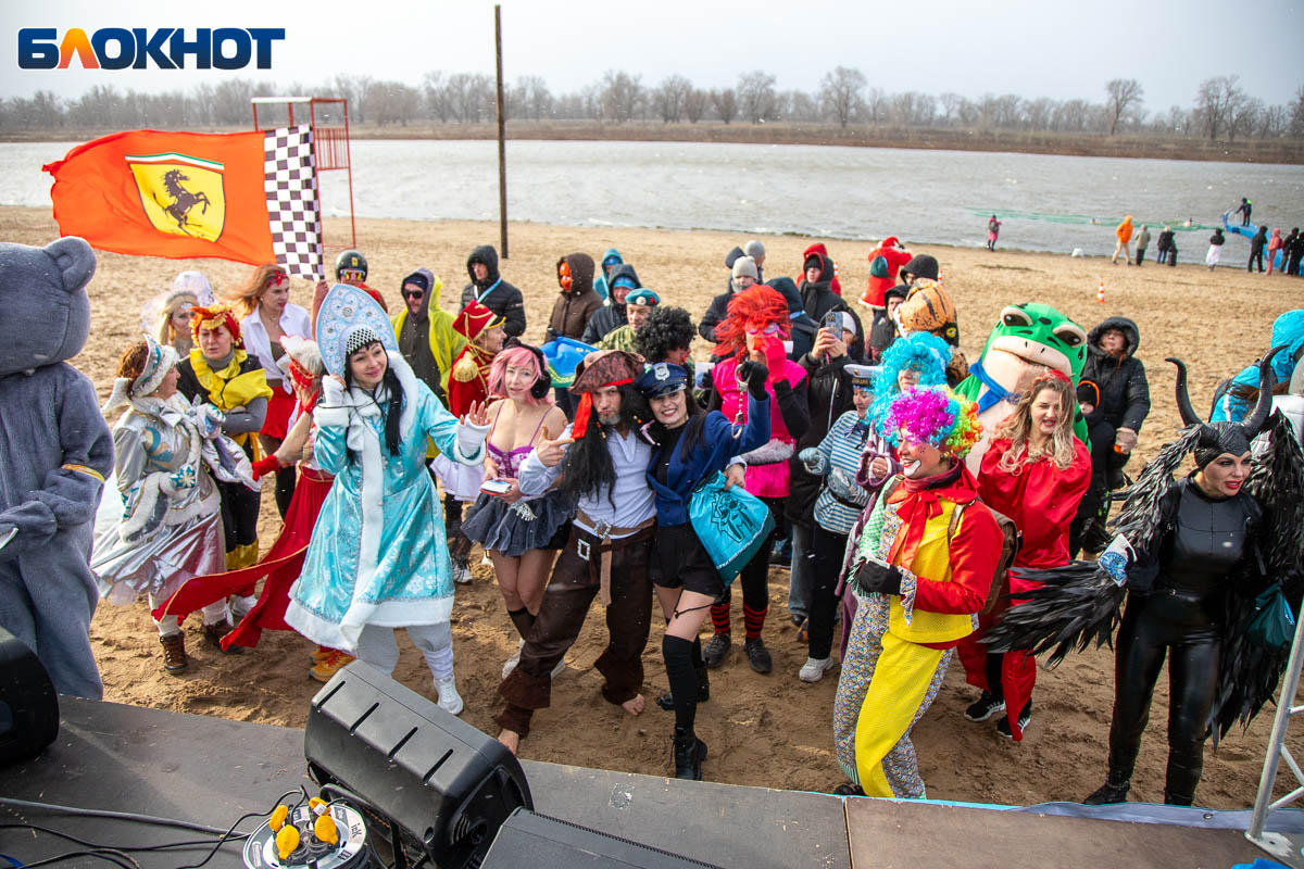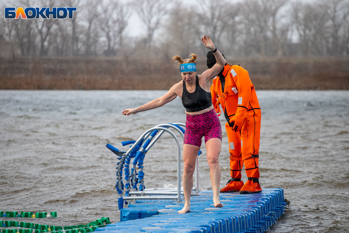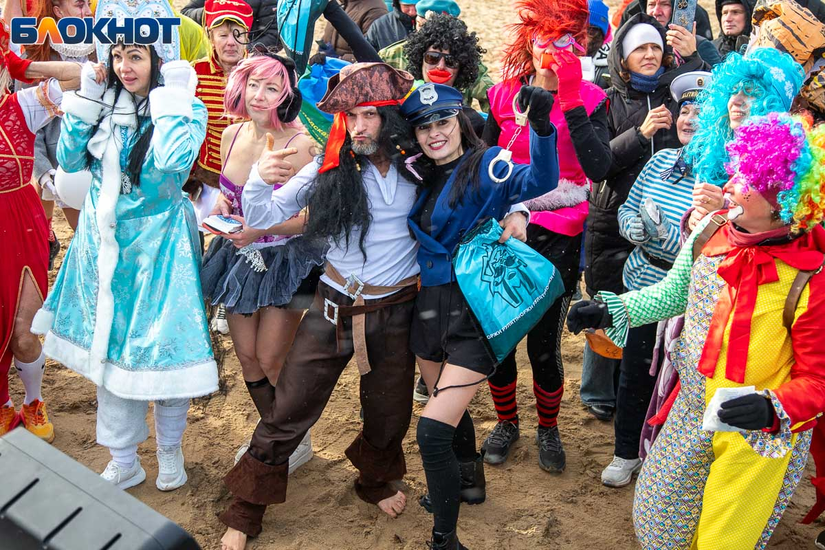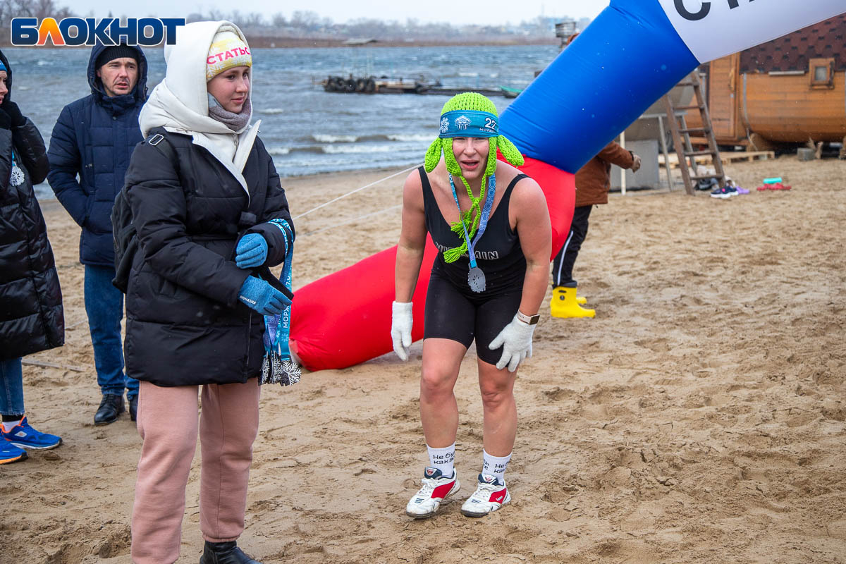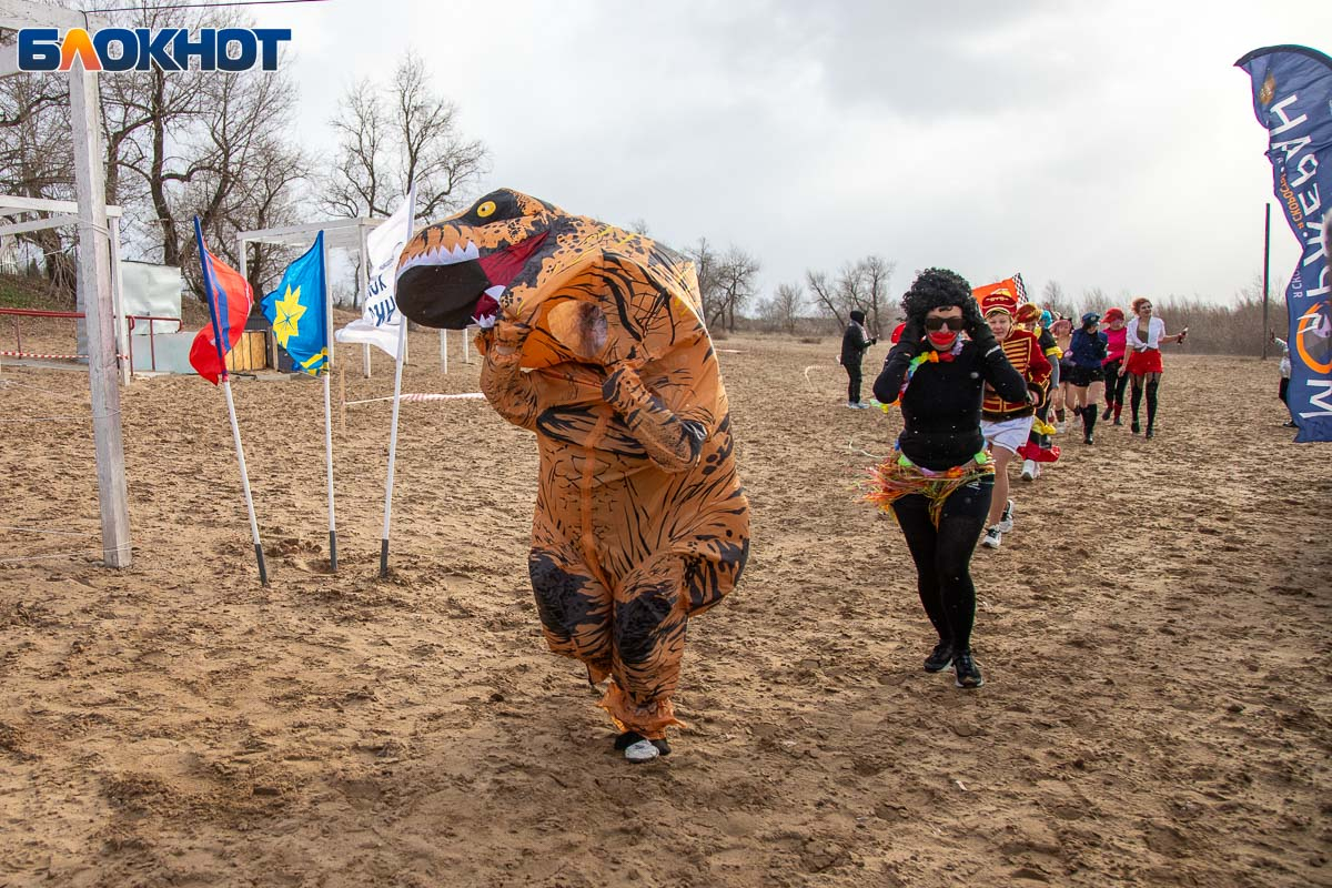 В Волжском спортсмены в топах и миниюбках пробежали по городу и прыгнули в ледяную воду во время шторма