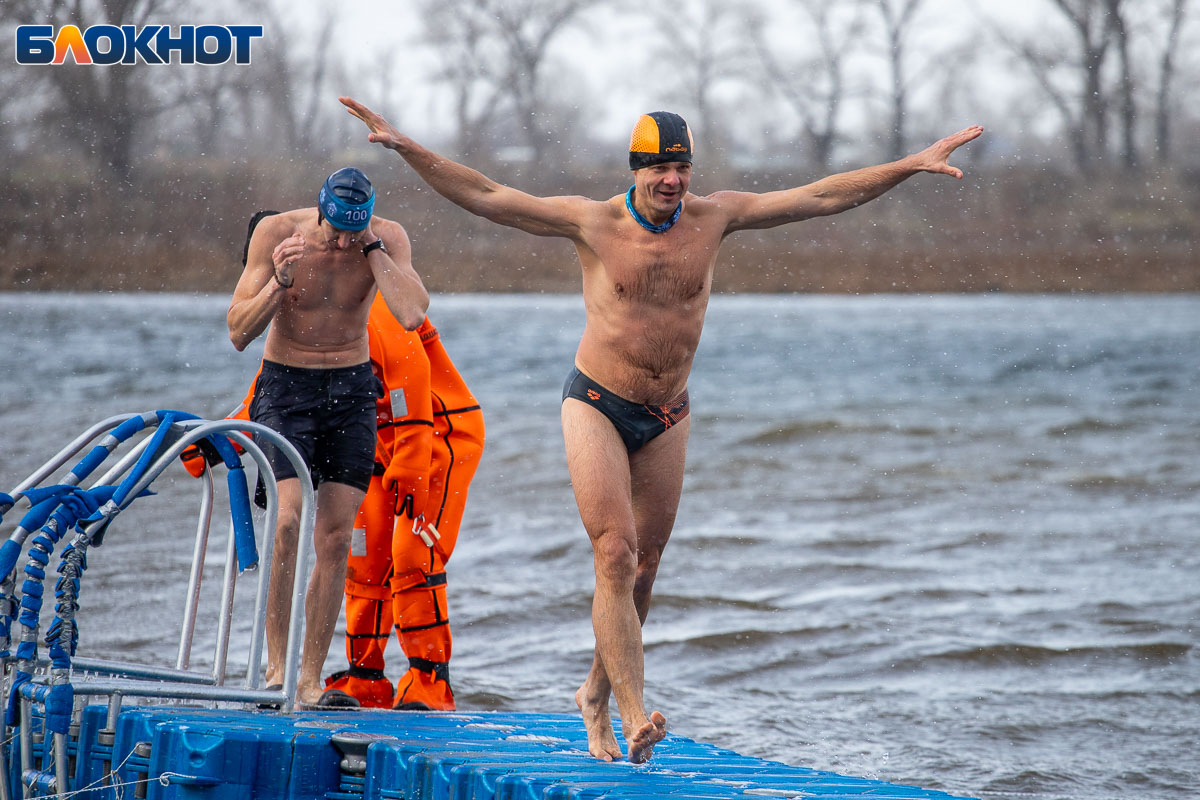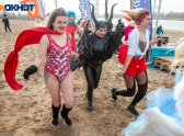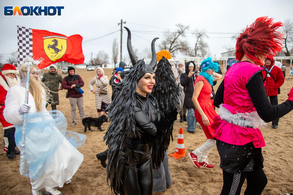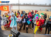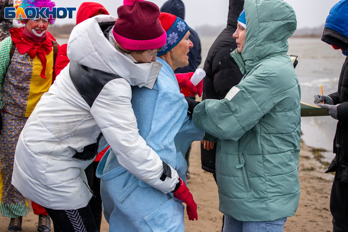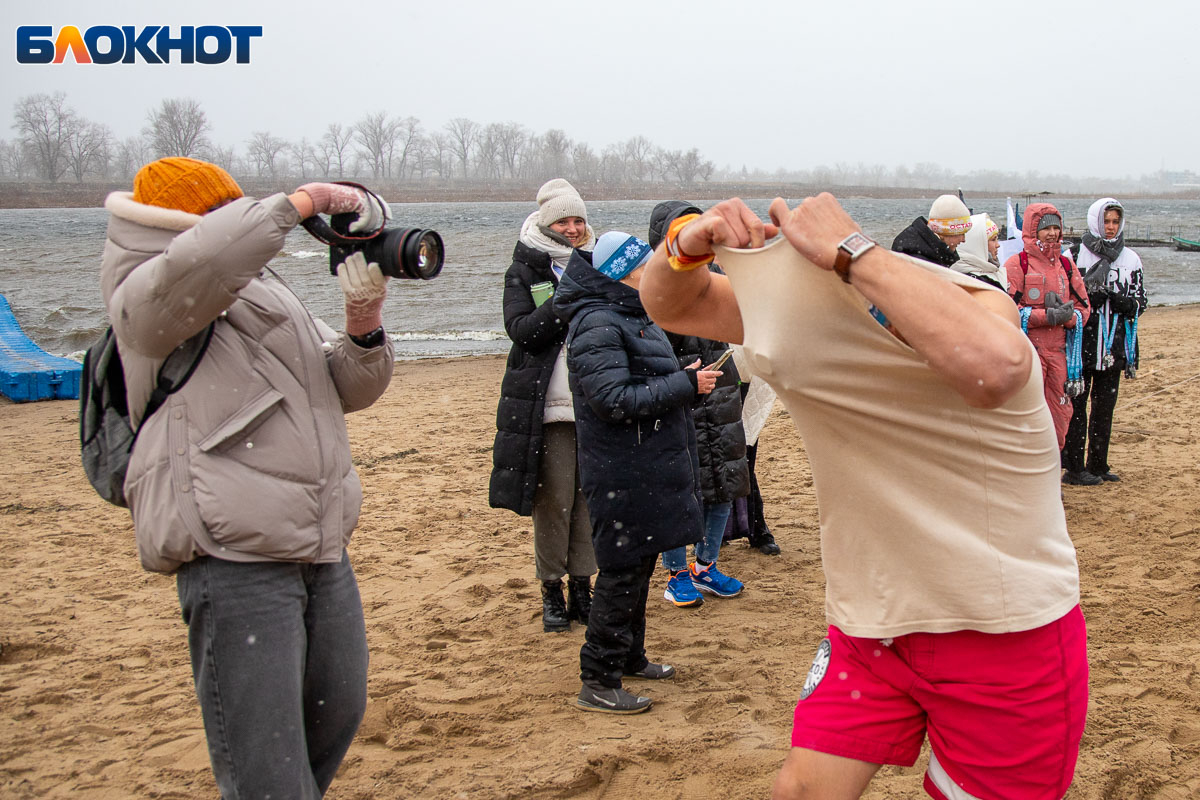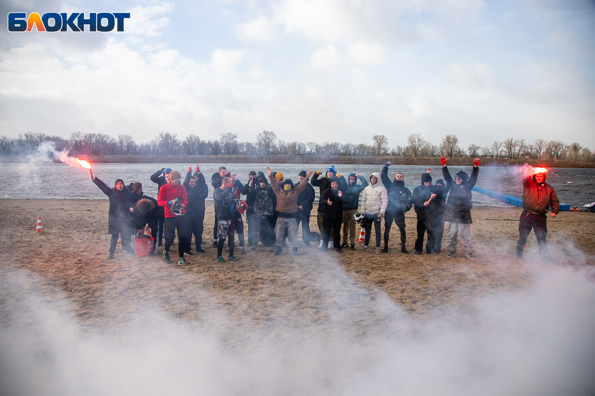 В Волжском спортсмены в топах и миниюбках пробежали по городу и прыгнули в ледяную воду во время шторма