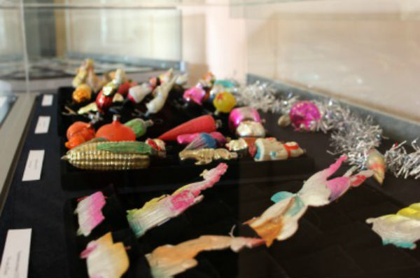 Игрушки из ваты, стекла, папье-маше, цепочки из бумажных и стеклянных гирлянд, бумажные флажки, фигурки Дедов Морозов и Снегурочек - все это можно увидеть в выставочном зале.