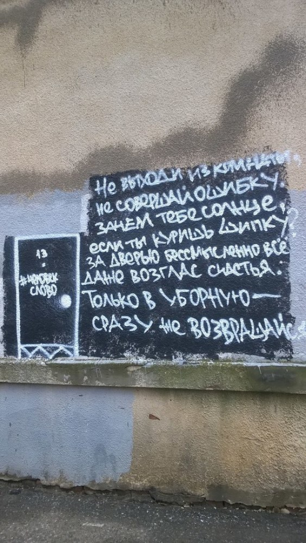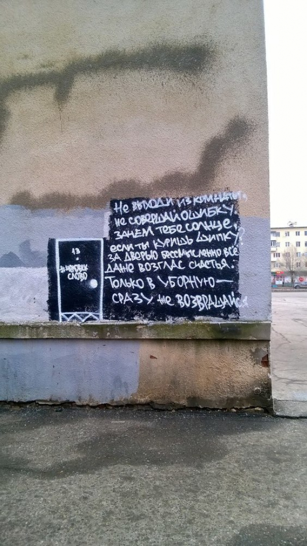 Но не часто увидишь стихотворения Иосифа Бродского на стенах. Граффити с короткими, но ёмкими строчками можно увидеть на обратной стороне кафе «Панорама» в центральном универмаге. Интересно, долго ли оно там будет находиться, и сделает ли исключение для Бродского администрация кафе, оставив стихи нетронутыми.