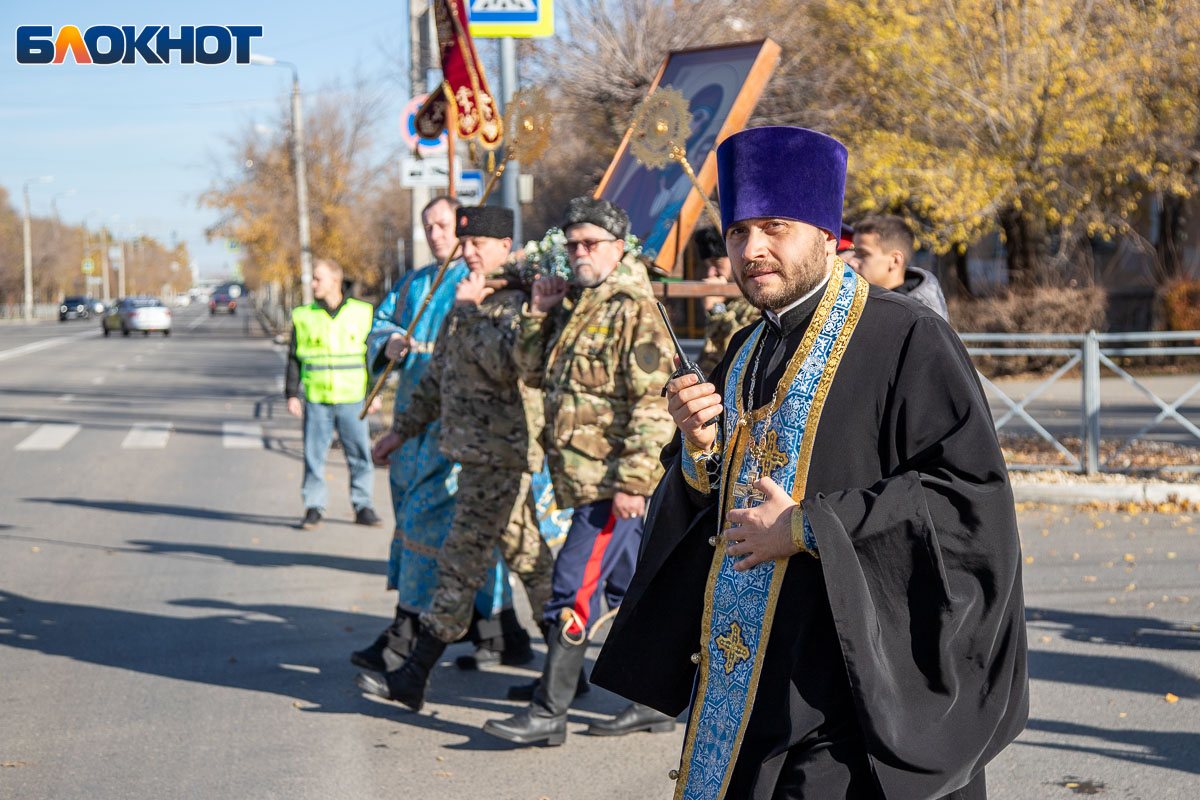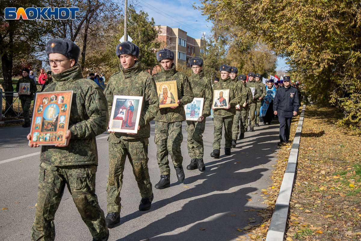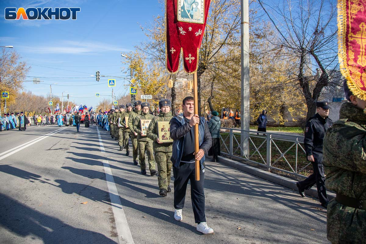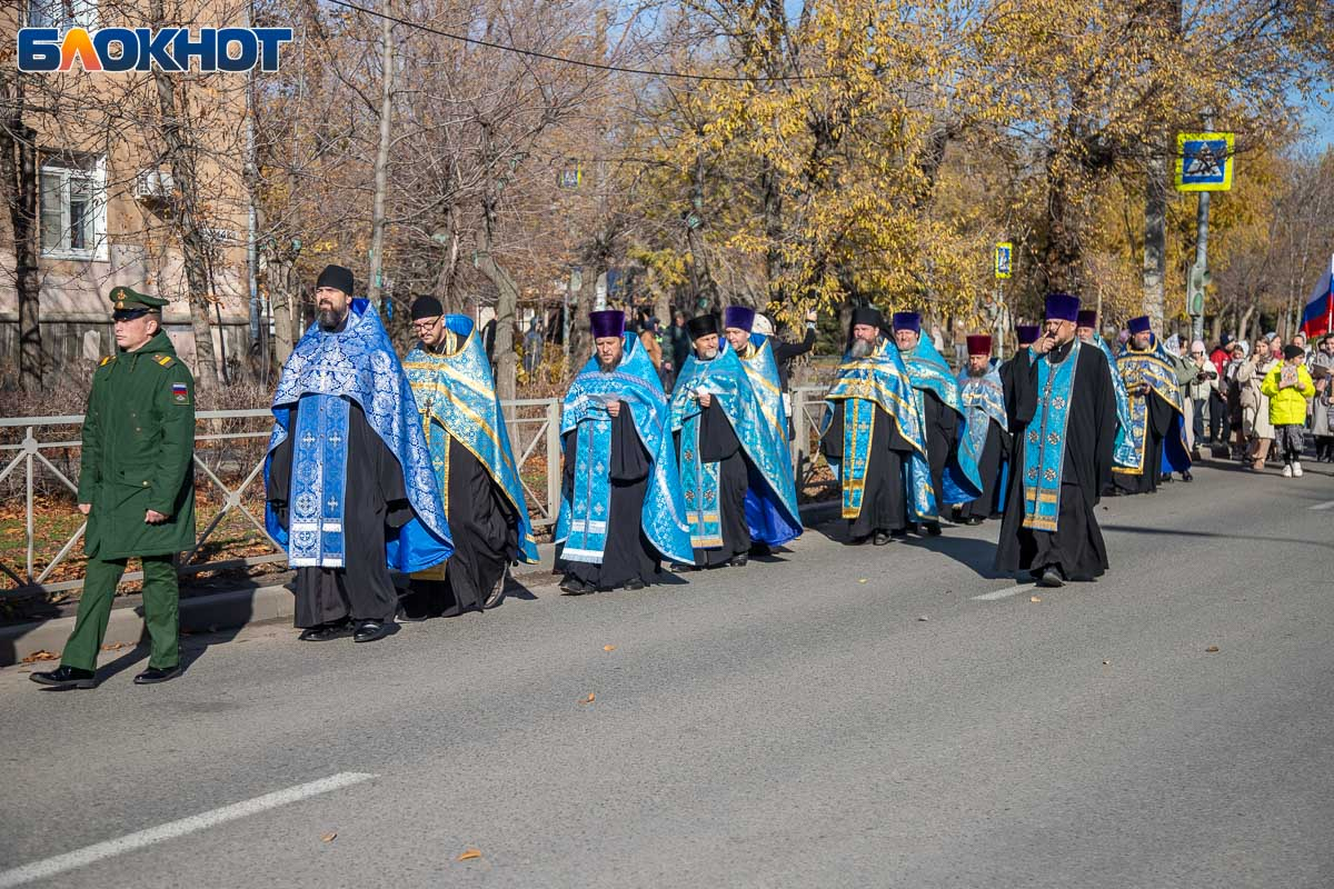 Возглавил крестный ход епископ Калачевский и Палласовский Иоанн. Рядом с ним в колонне шли священнослужители Волжского благочиния, участники СВО и их родственники, военнослужащие, казаки, представители администрации и городской Думы, общественных организаций, а также школьники и студенты.