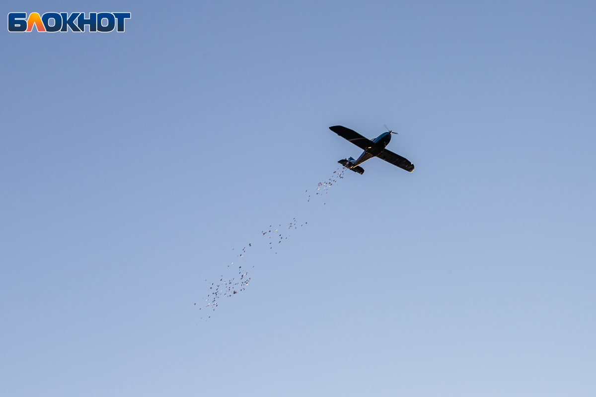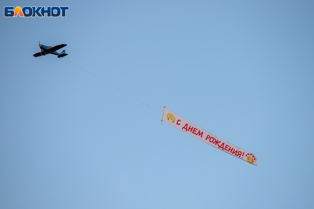 Старт праздничным мероприятиям дало необычное поздравление с воздуха. Пилот Павел Шабалков, управляя самолетом «Эвектор Гармония», пролетел над главной площадью города, осыпая зрителей 10 тысячами красочных листовок и демонстрируя баннер с поздравлением.